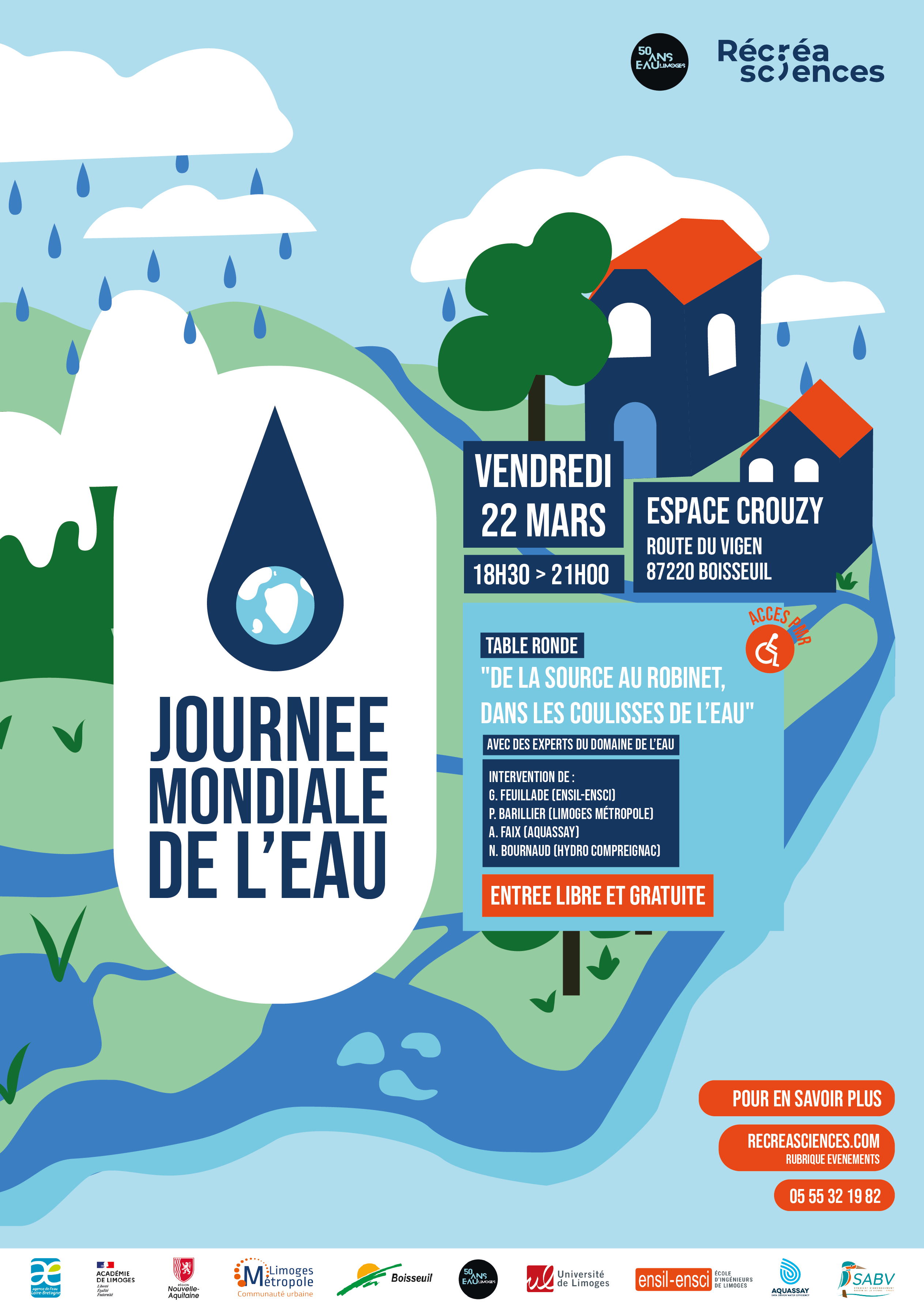 En 2024, Récréasciences a choisi d’organiser une journée de sensibilisation avec pour thématique générale – L’eau, de son origine à ses enjeux contemporains – le vendredi 22 mars 2024 à l’espace du Crouzy de Boisseuil (87).